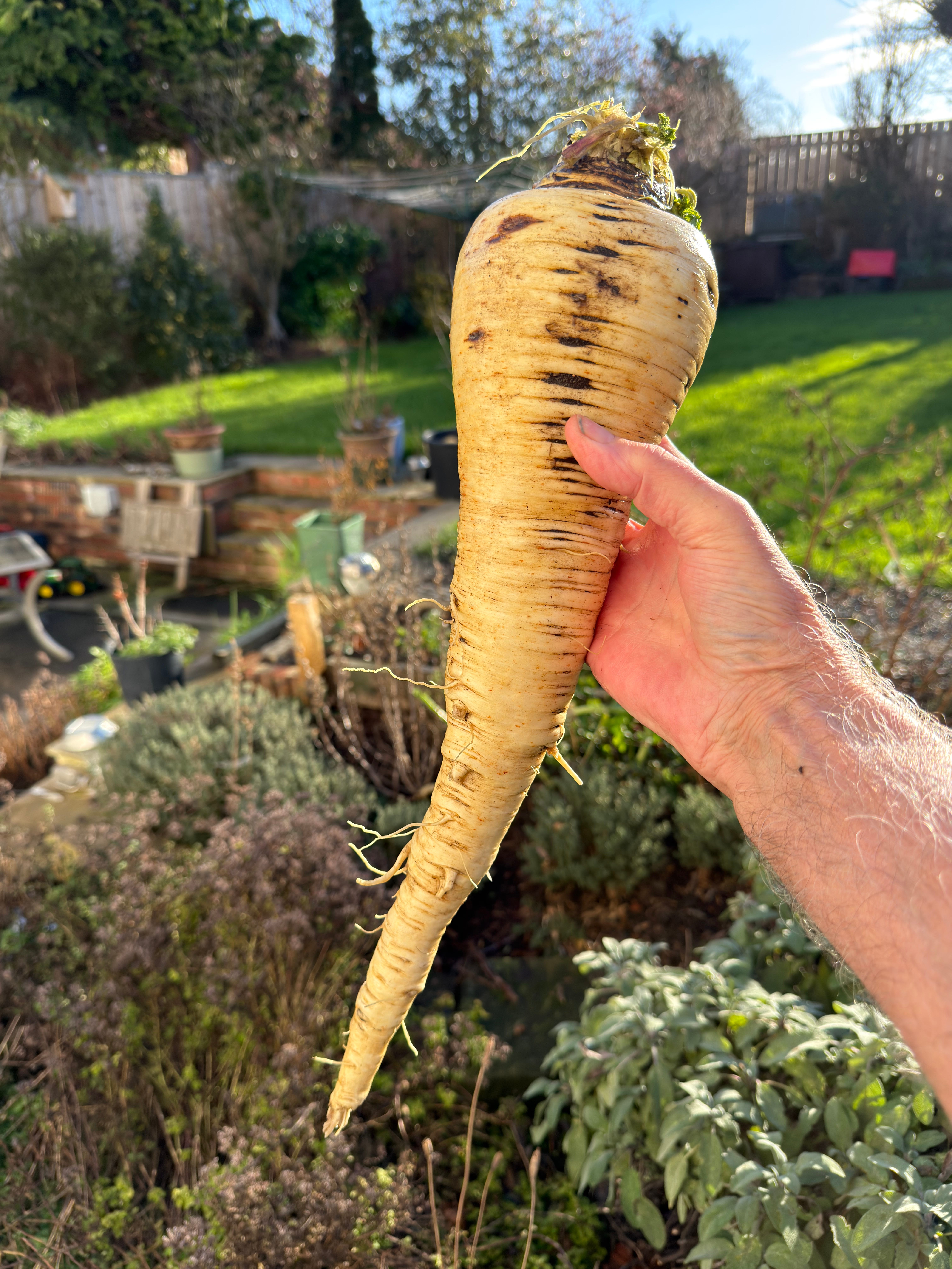 Above: I know the soil in my cold-frames is ~3’ deep, end-to-end. I built them from the ground up. However, I didn’t expect the parsnips to grow quite this big. Getting them out of the ground is a mammoth task. This one specimen weighed in at 2.75lb.