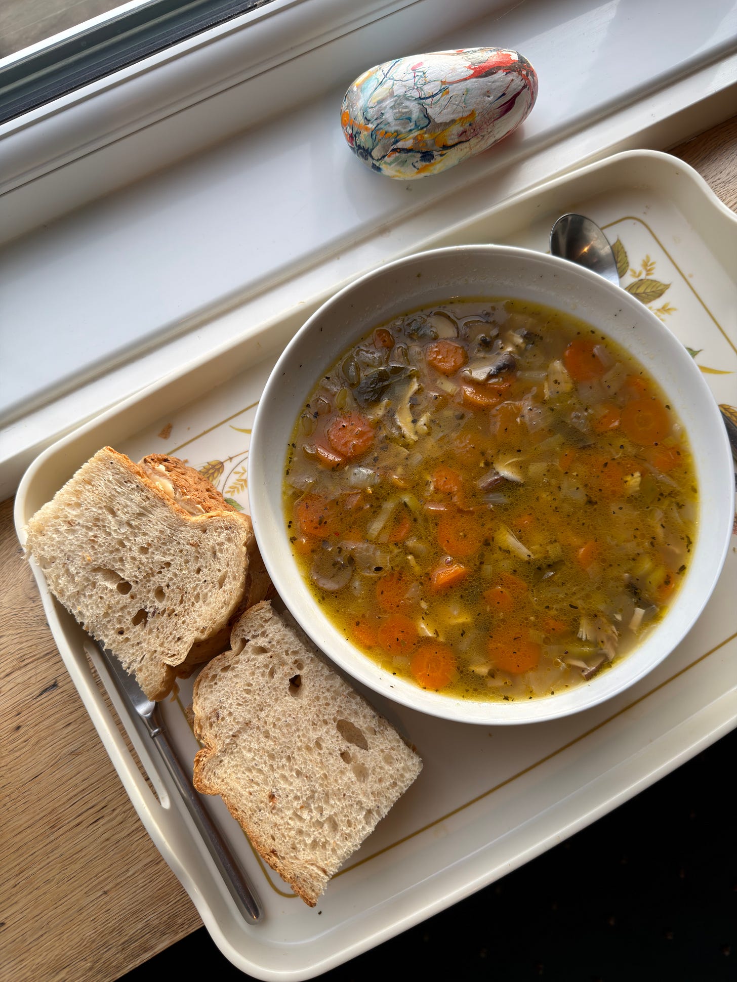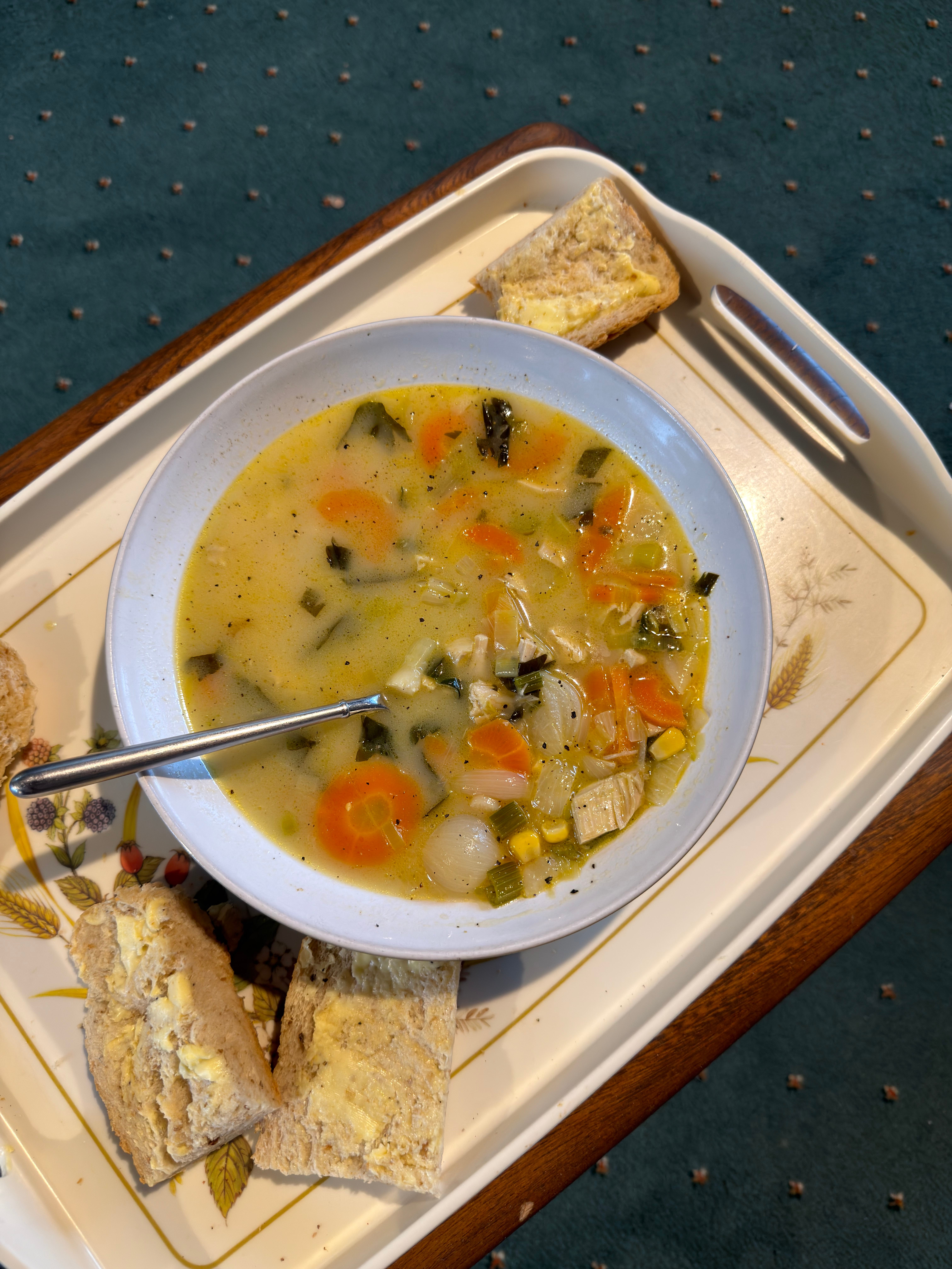 Above: Turkey soup, made with the bones, a garlic clove, onions, herbs, baby leeks and a few good-sized carrots. A dash of full-cream milk, half a tin of sweetcorn and a stock-pot, it was as sweet as a nut and completely different to broth made from a 5lb chicken. The chicken broth is better still, by far. It’s full-bodied and sets to a jelly.