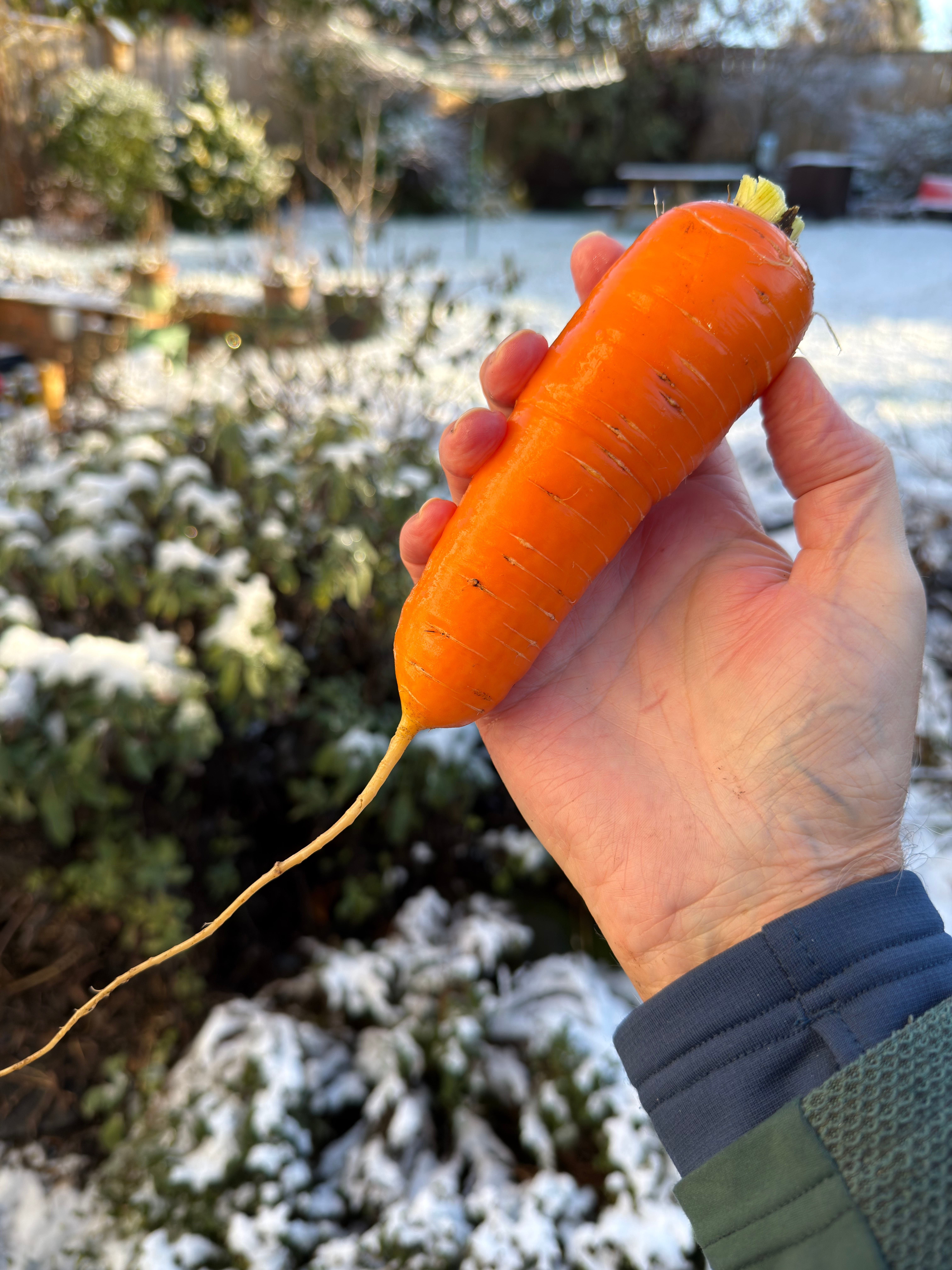 The long and the short of it: During our hour of trial, and it was a trial, watching our son suffering so much, whilst the rest of the village was partying and winding down for Christmas festivities, we had a garden to fall back on and help sustain us, when food, otherwise, would have stuck in our craw. We didn’t want to eat; but we also desperately needed to, to fuel the fight. Stress consumes vast amounts of energy. Onions and carrots, with herbs and tender leeks for soups, when soups and fresh bread and butter were the only things we could stomach, really helped to save the day, ferried to the hospital in flasks on a daily basis; and carrots, leeks, parsnips and ‘new’ potatoes for roasts and stews, when our son had finally turned the corner and was discharged from the ward into community care, and we could all breath a big sigh of relief and face a proper dinner, made for real celebration. It’s not a gimmick. Having that food-source right on our doorstep is key. No need to go shopping; no need to expend time or energy you don’t have.