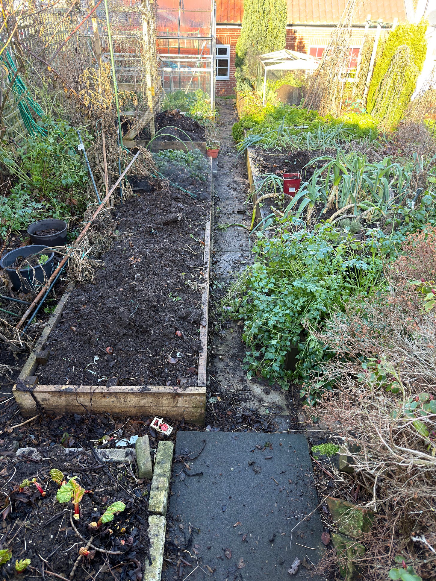 So, I bit the bullet yesterday, after the snow melted, and emptied the wormery of all of its high-octane contents, twelve long months’ worth of consolidated worm excrement, and extremely heavy with it. That’s twenty bucketful’s in all, carried up two flights of steps to the plot. But, what may seem like a thankless task, on the face of it, and certainly halfway through, I was beginning to question my sanity, slip-sliding away in the mud, becomes unavoidable, once the New Year kicks in and frosts become the order of the day, under clear blue, cloudless skies. For, with the cold snaps typical of January, the worms’ metabolism grinds to a complete halt, the bin overtops and veg trimmings from our roasts, soups and casseroles start to accumulate outside the kitchen door, in vast amounts. It’s the easiest place to put them. I suppose that’s good. They don’t attract vermin and, once emptied, the wormery needs recharging with a fresh batch of greens, in order to feed the two buckets-worth, heaving with worms, that I skimmed from the top and set aside to carry on the task of turning waste into gold, in 2026. And they do, year in, year out. Thirty now and counting. If you don’t have a wormery, I’d consider starting one. They’re simple to set up and easy to maintain. Only my 50/50 manure/leaf-mould mix comes anywhere close, when it comes to boosting soil fertility and yields. And it’s completely free.